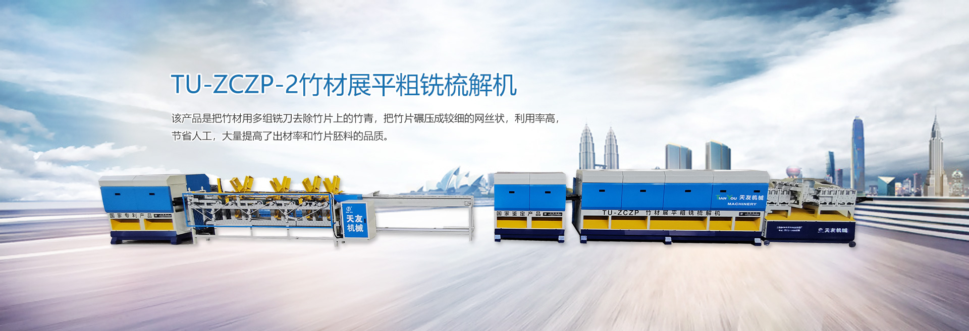 本廠生產的“天友”牌竹木兩大系列機械產品,品種齊全,包括(竹木機械、重竹設備、竹筷成套機械、牙簽成套機械、刨篾機、包裝機、竹地板成套設備、竹涼席成套設備、砂光機、破竹機、拉絲機、精刨機、帶節雙生筷、天削筷機械等) ,結構新穎,質量上乘,以完善的售后服務體系深受客戶的好評。